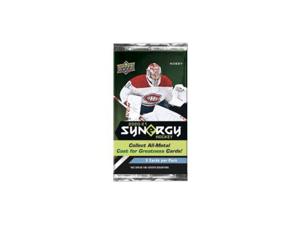 Tento hobby pack obsahuje 3 karty z edície „Synergy“ hokejových kariet na sezónu 2020-21, s možnosťou nájsť podpísané autogramy či low-number paralely. Obsahuje rozmanitú základnú sadu, vložené „Tech/Acetate“ karty a špeciality ako „Synergy FX“, „Cast for Greatness“ či „Exceptional Stars“.