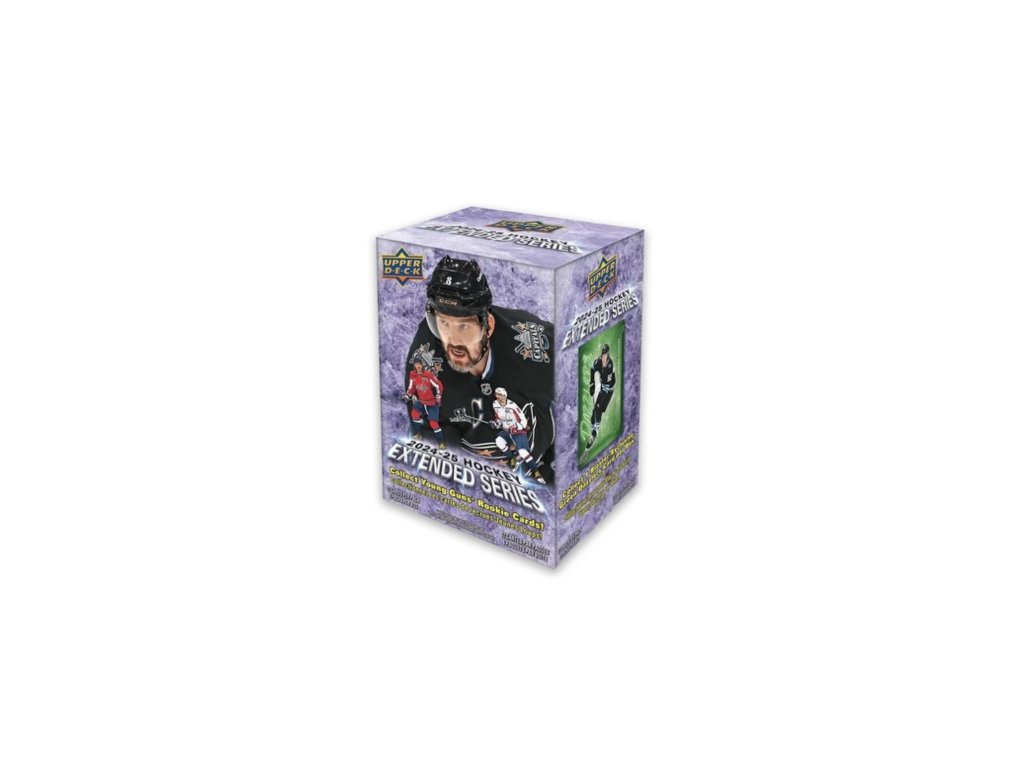 Hokejová krabička Upper Deck Extended Series Hockey Blaster Box 2024-25 obsahuje 4 balíčky po 12 kartách (celkom 48 kariet) a je navrhnutá tak, aby pomohla dokončiť základnú sadu 2024-25 pridaním posledných 250 kariet – 200 kariet veteránov a 50 kariet Young Guns® /1st Round Rookies – spolu s kombináciou vložených sád, ako je exkluzívna sada Blaster „Green Dazzlers“.