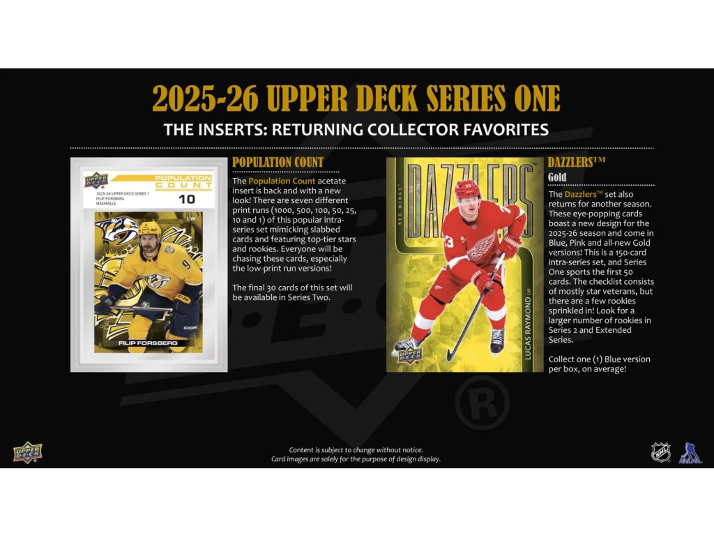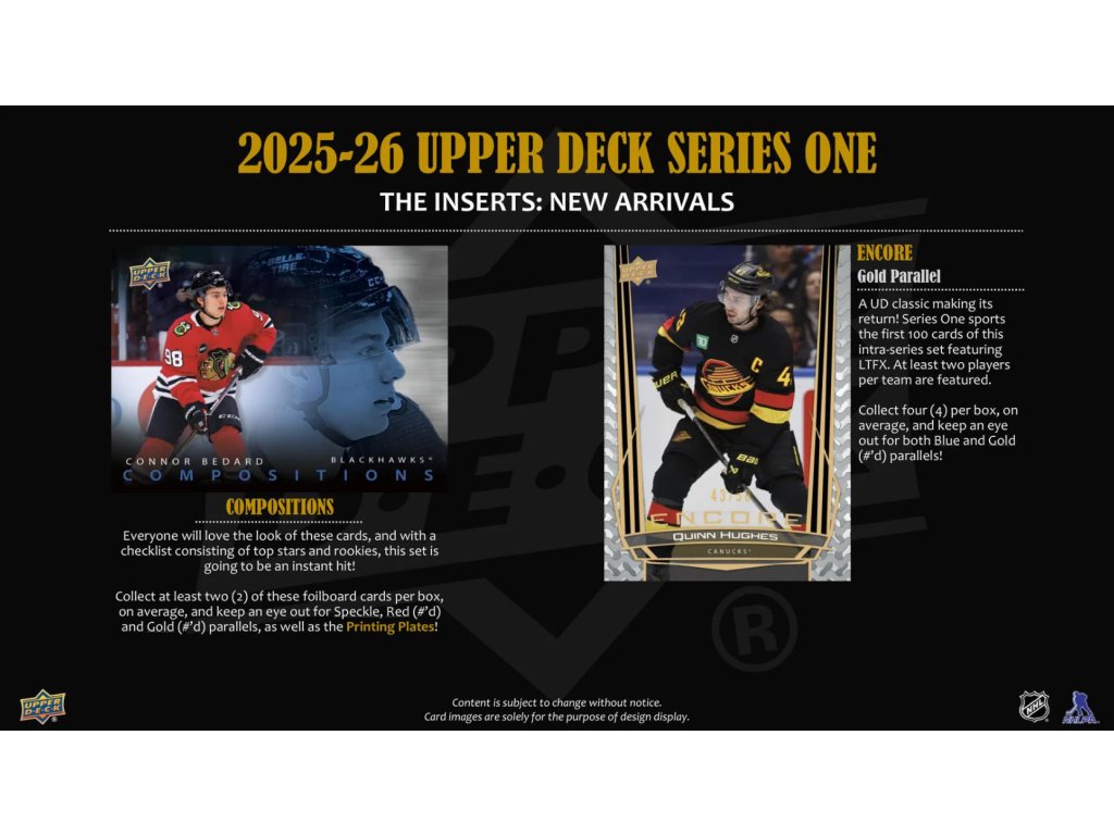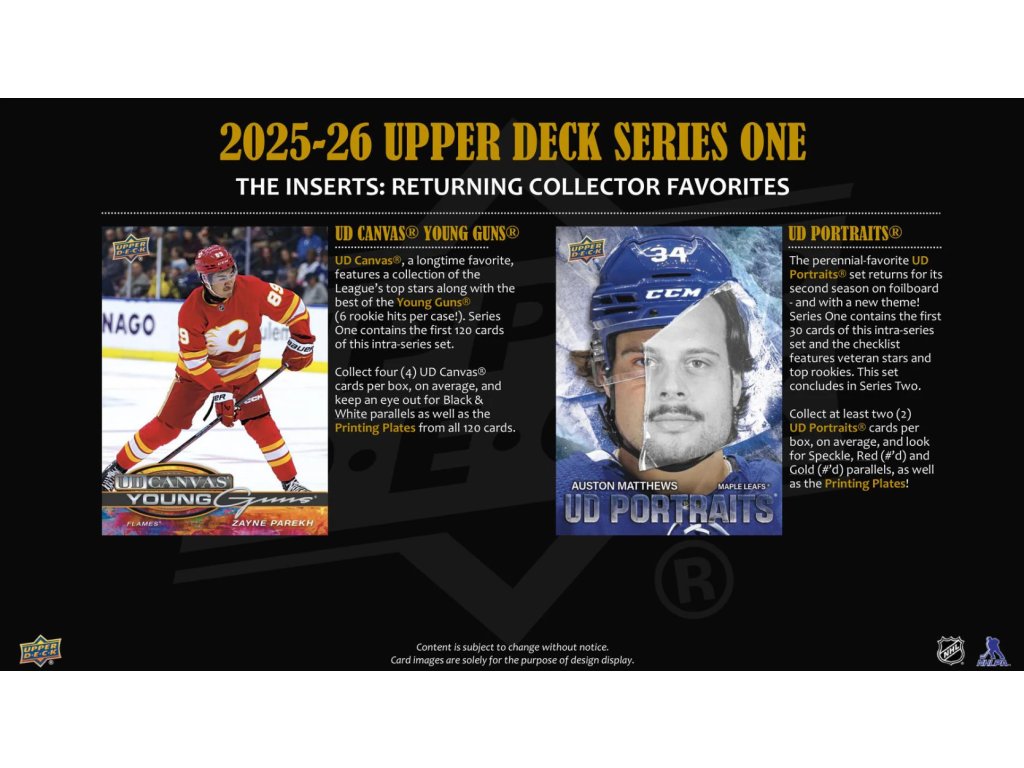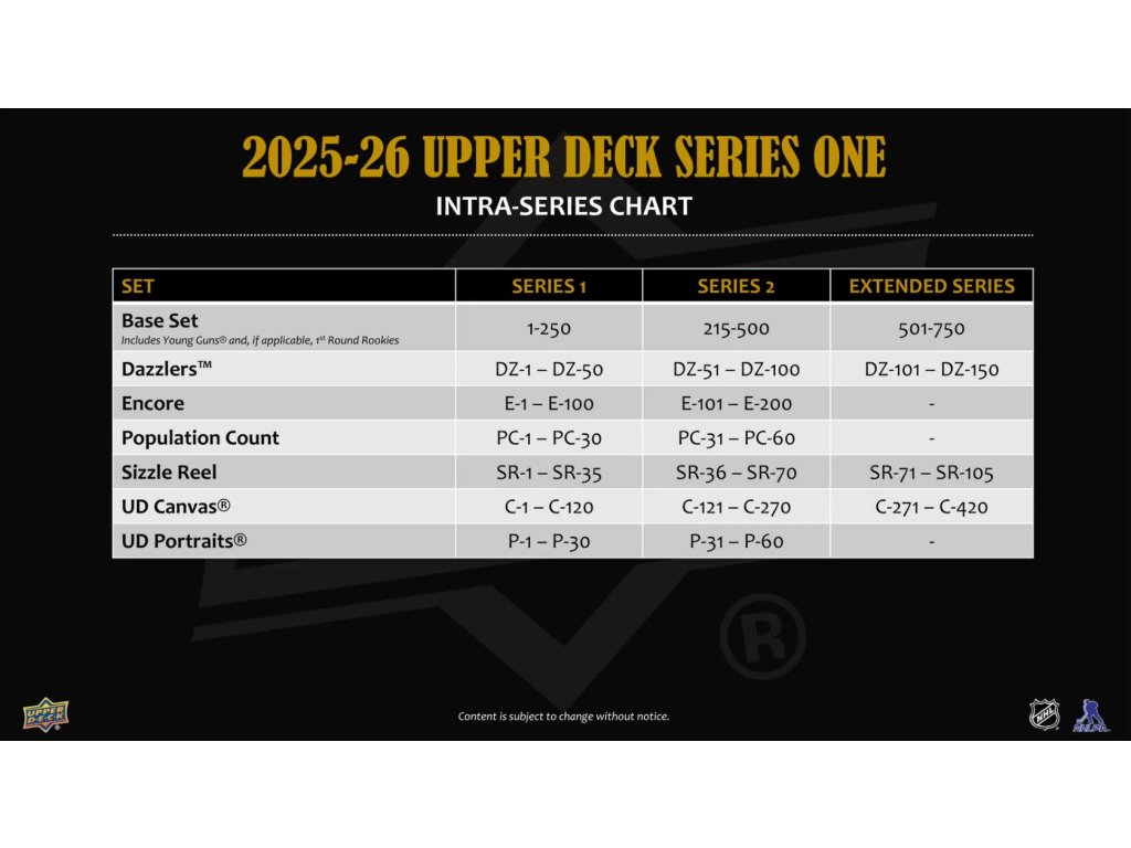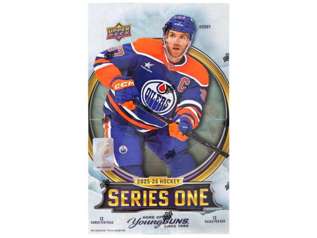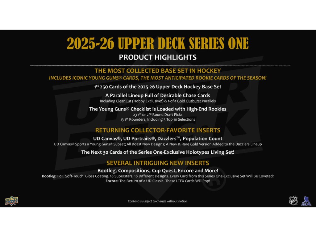 Edícia 2025-26 Upper Deck Series 1 Hockey predstavuje prvých 250 kariet základnej série, ktorá zahŕňa 198 veteránov, 49 Young Guns a 3 checklisty. Young Guns sú najžiadanejšie rookie karty sezóny, pričom checklist je plný špičkových nováčikov. Každý box obsahuje v priemere šesť Young Guns kariet, štyri UD Canvas, štyri Encore, jednu Outburst Silver paralelu a jednu Blue Dazzlers kartu.