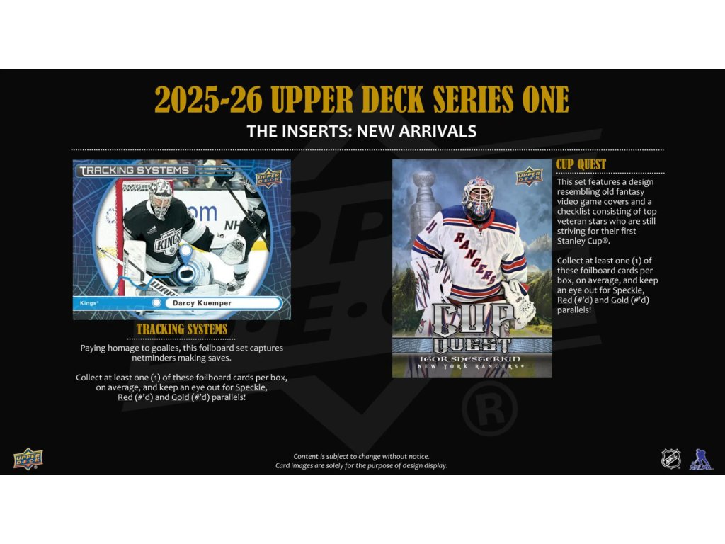 Nové inserty pre sezónu 2025-26 zahŕňajú Bootleg – ultra vzácne karty s 18 dizajnmi hviezd, Encore – 100 kariet s dvoma hráčmi na každom tíme a paralelami Blue a Gold (#/50), Compositions – umelecký dizajn s top hráčmi a nováčikmi, Cup Quest – retro videoherný štýl s hráčmi bojujúcimi o Stanley Cup, Bustle – pocta hráčom známych pre ich nasadenie, Compadres – fotografie spoluhráčov, Goal Oriented – najlepších strelcov ligy, Sizzle Reel – momenty sezóny 2024-25 s QR kódom vedúcim na video, a Tracking Systems – brankárske zákroky a reflexy.